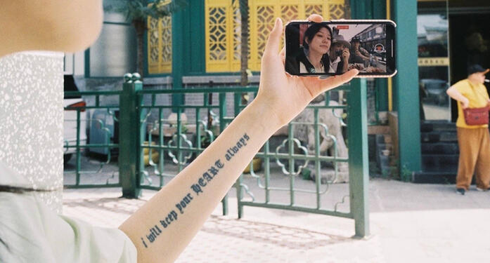 A tattoo can be seen on her left arm that says: